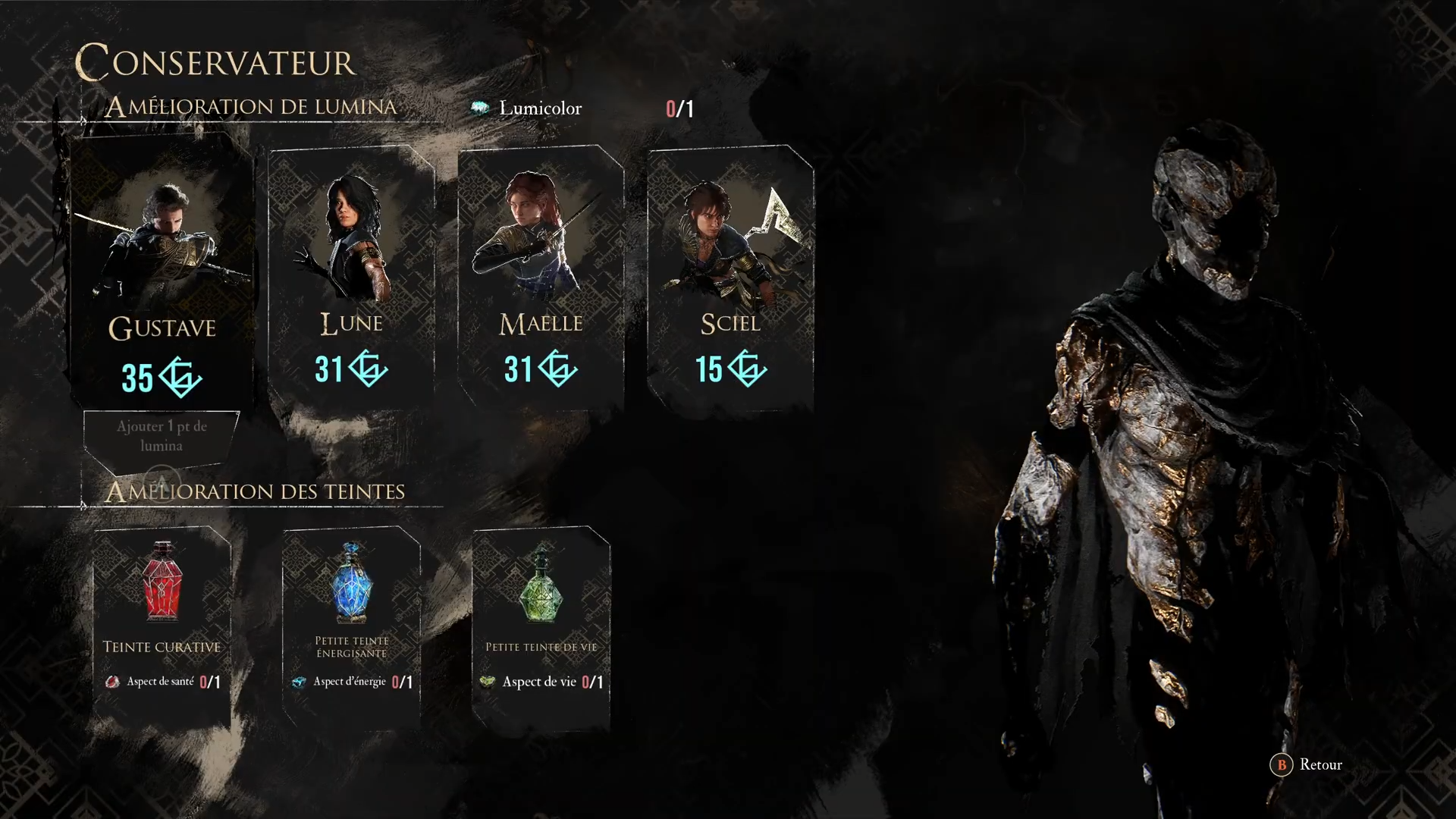 Grâce au conservateur, vous serez en mesure d’augmenter vos points Luminas et utiliser des aptitudes plus intéressantes pour vos personnages. Pour cela, allez le voir dans votre campement et