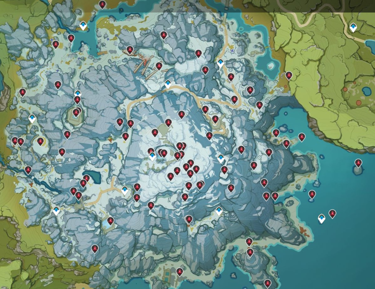 La carte des emplacements des agates pourpres avec les téléporteurs proches (crédits : Genshin Impact World Map)