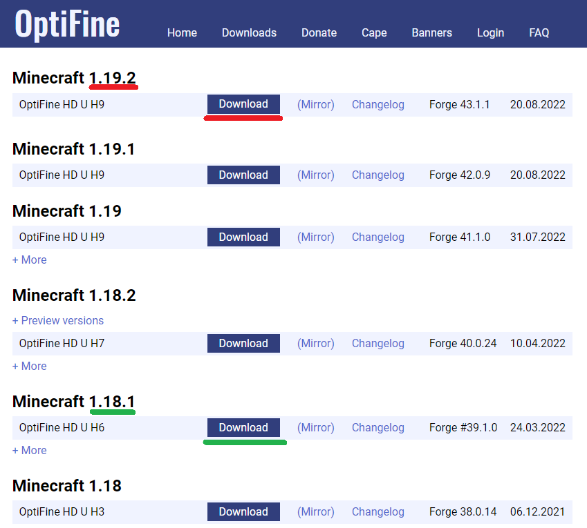 Enfin il ne vous reste plus qu’à choisir la version que vous souhaitez (exemple : 1.19.2) et cliquer sur Download.