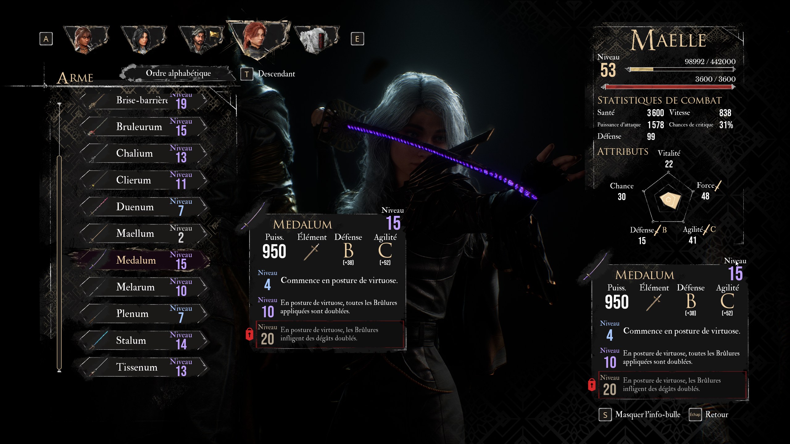 - Niveau 10 : Passe automatiquement en posture de virtuose en brisant le moindre bouclier