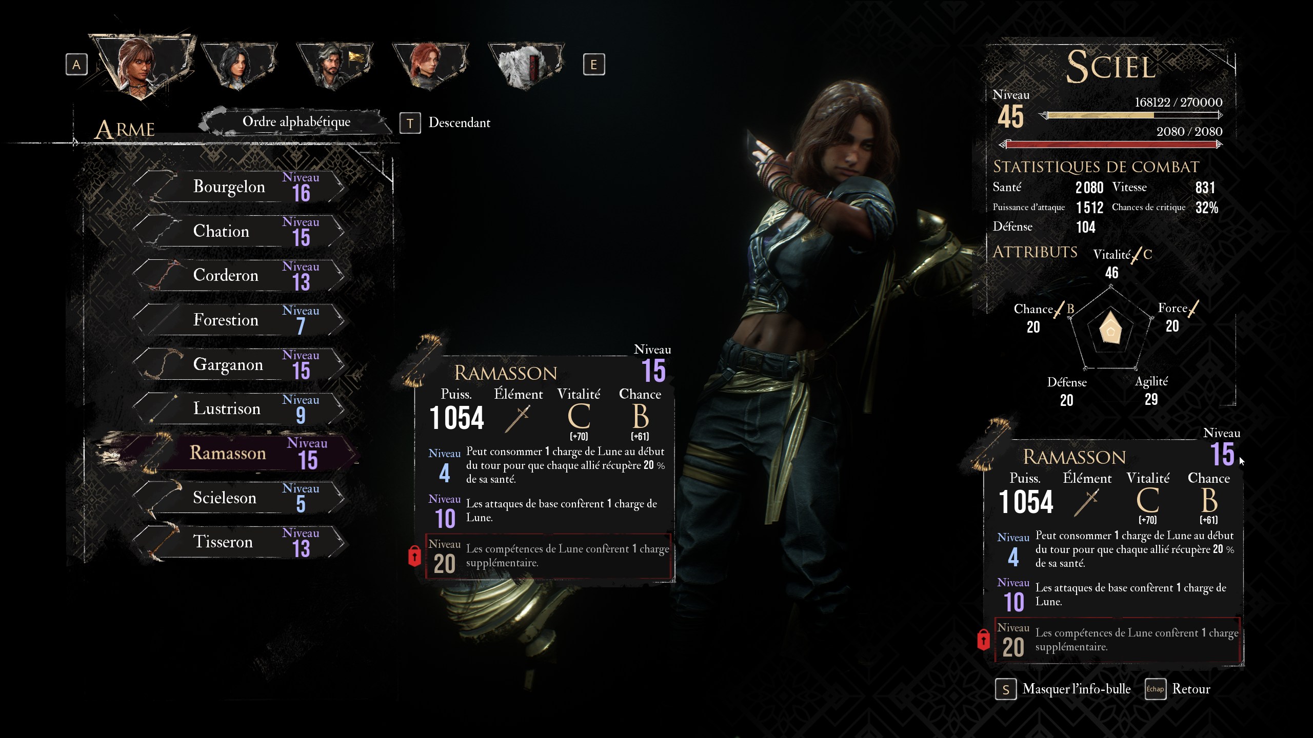 Si vous souhaitez faire de Sciel, un personnage efficace contre les boss, cette arme peut être très utile puisque vous pouvez soigner vos alliés, mais aussi, récupérez des charges de Lune