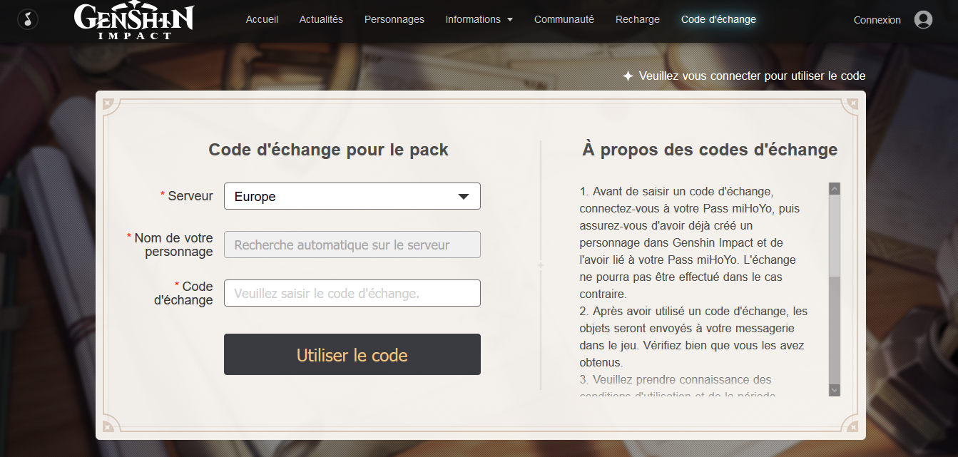 des codes d’échange pour obtenir des récompenses supplémentaires dans le jeu. Ces codes s’utilisent directement sur le site du jeu, mais pour cela, il est nécessaire d’avoir un « Pass Mihoyo ».