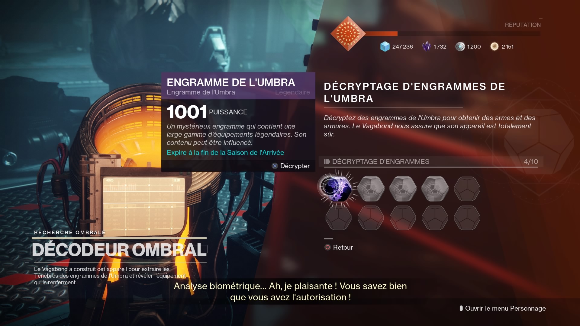 Cliquez enfin sur la touche indiquée sous votre Engramme de l’Umbra pour le décoder avec le Décodeur ombral.