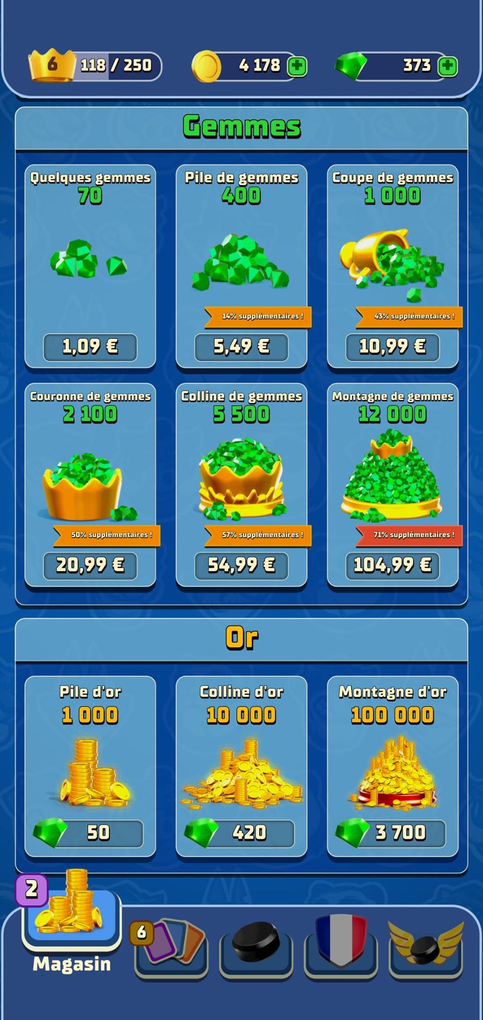 Hockey a été développé en association avec Supercell, on retrouve les deux monnaies traditionnelles : l’or et les gemmes. Les gemmes sont difficiles à avoir et servent à accélérer sa