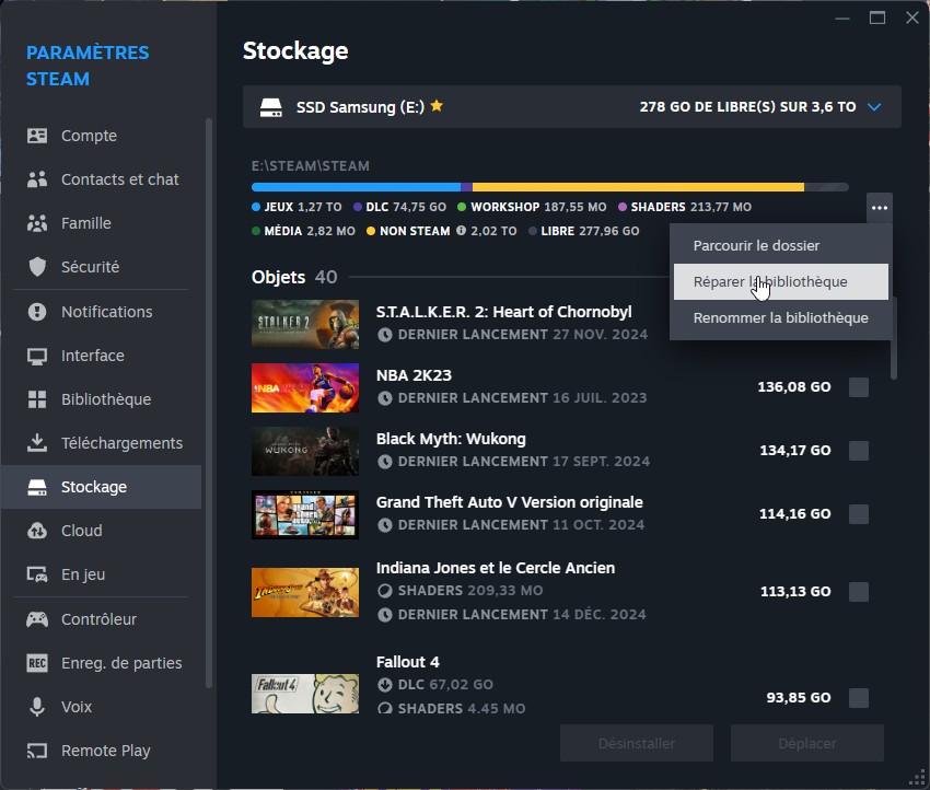 Vous pouvez aussi tenter de réparer la librairie Steam en cliquant sur Steam, puis sur Stockage. Il vous faut ensuite cliquer sur les trois petits