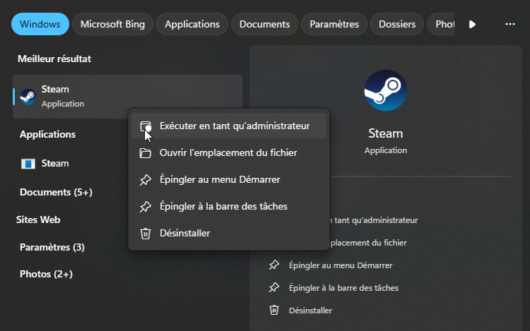Fermez InZOI, ainsi que Steam, puis relancez l’application en Administrateur en faisant un clic droit sur Steam et en sélectionnant Exécuter en tant qu’administrateur. C’est la