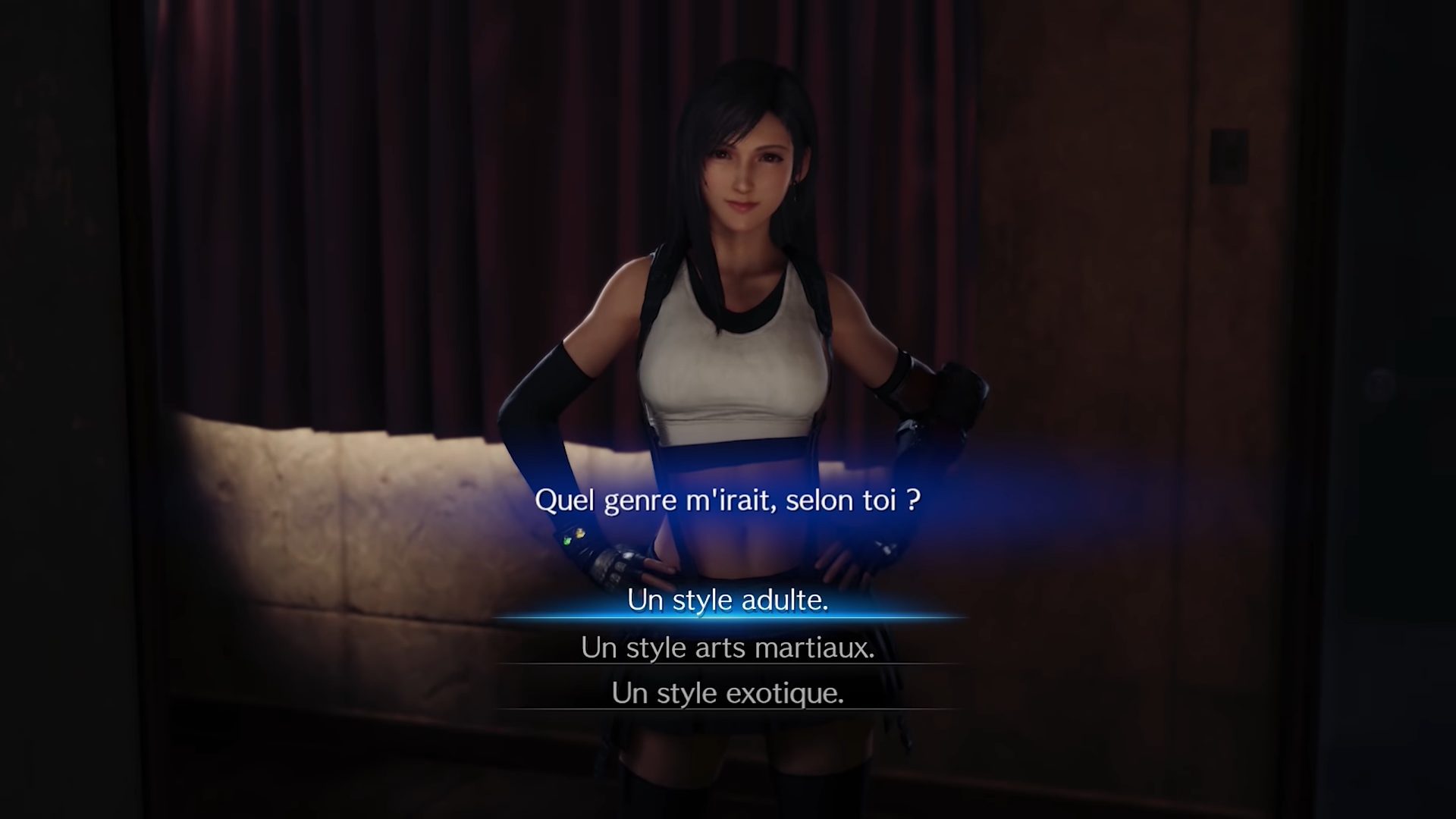 Pour cette dernière tenue, vous devez conseiller à Tifa un style exotique lors de la mission annexe « Un moment à deux » au chapitre 3.
