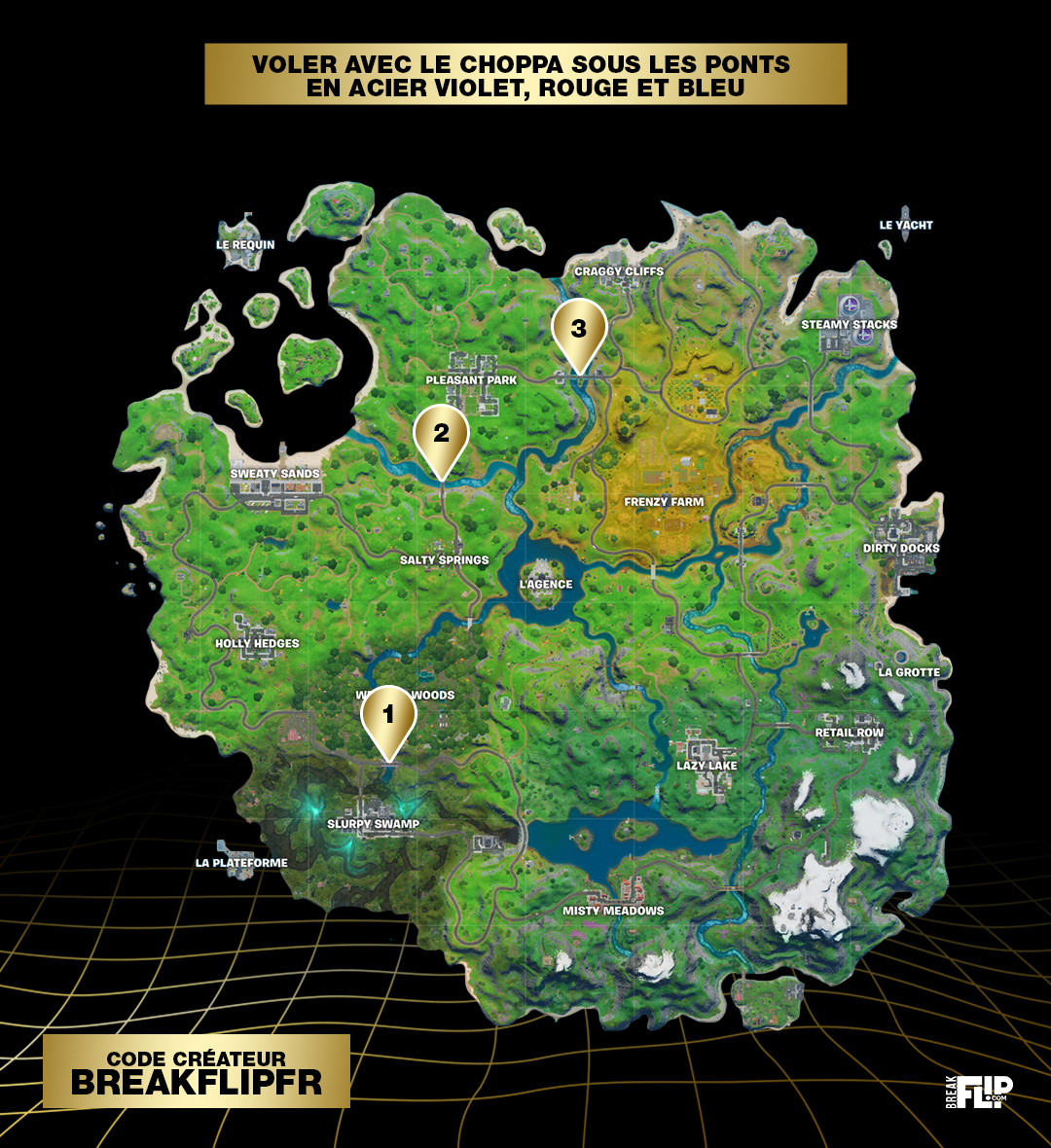 Le pont en acier violet se trouve au sud de la map, sur la rivière qui traverse Slurpy Swamp et Wailing Woods !