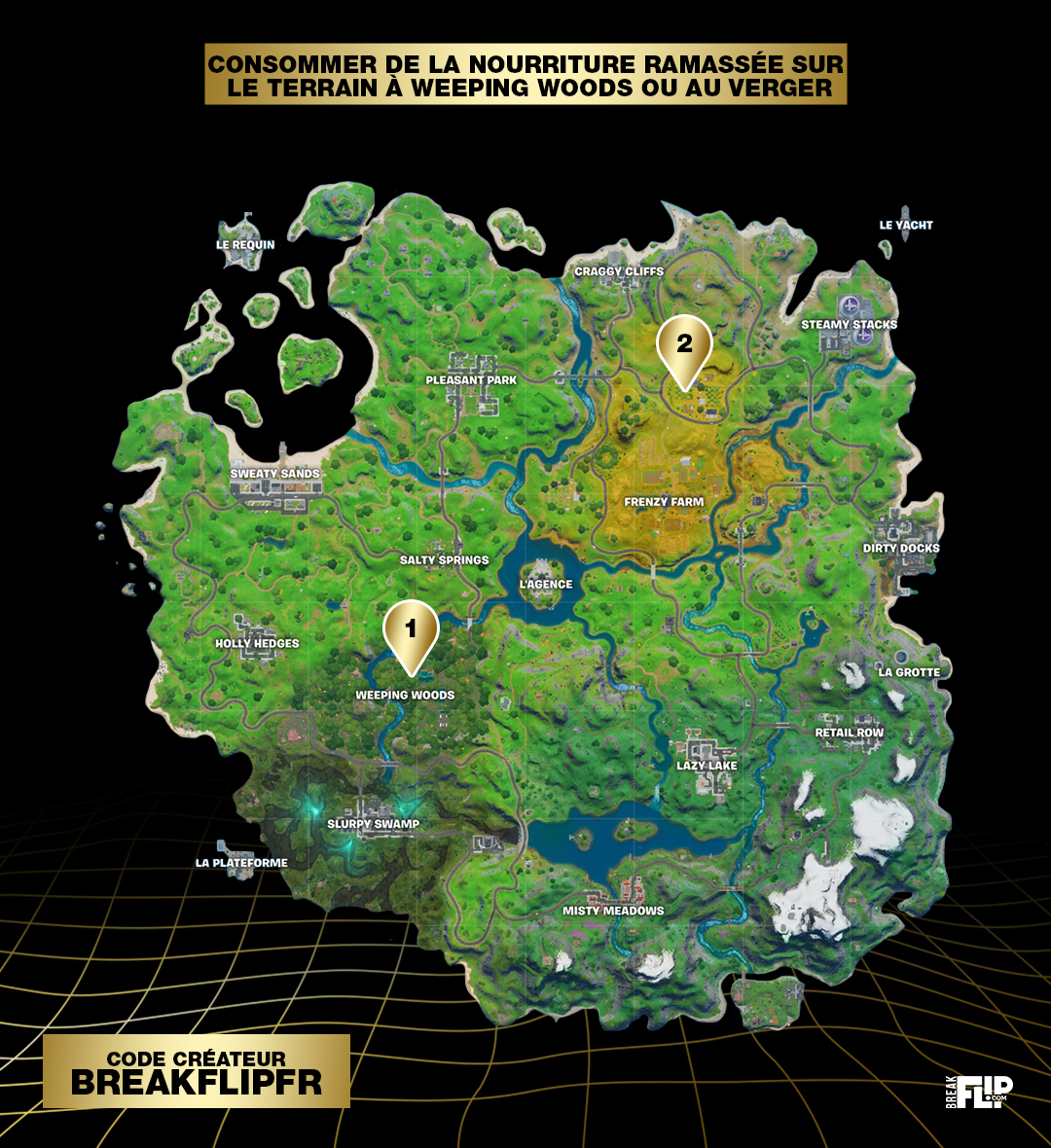 Fortnite : Consommer de la nourriture ramassée sur le terrain à Weeping Woods ou au Verger, défi semaine 7 saison 2