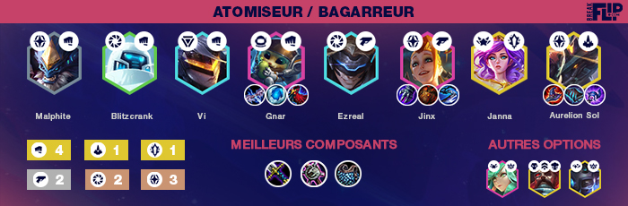 Tactics se base sur les dégâts physiques en zone des Atomiseurs, notamment Jinx, couplés avec la tankiness des Bagarreurs afin d’offrir une équipe très équilibrée et efficace.