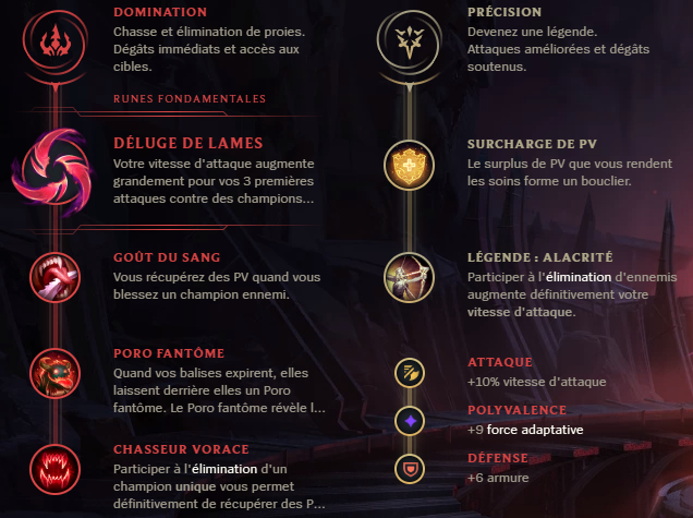 utilise la rune primordiale Déluge de lames pour envoyer 3 attaques rapides sur l’adversaire, puis activer son E (en ayant préalablement fait en sorte d’achever un sbire avec pour reset le CD du
