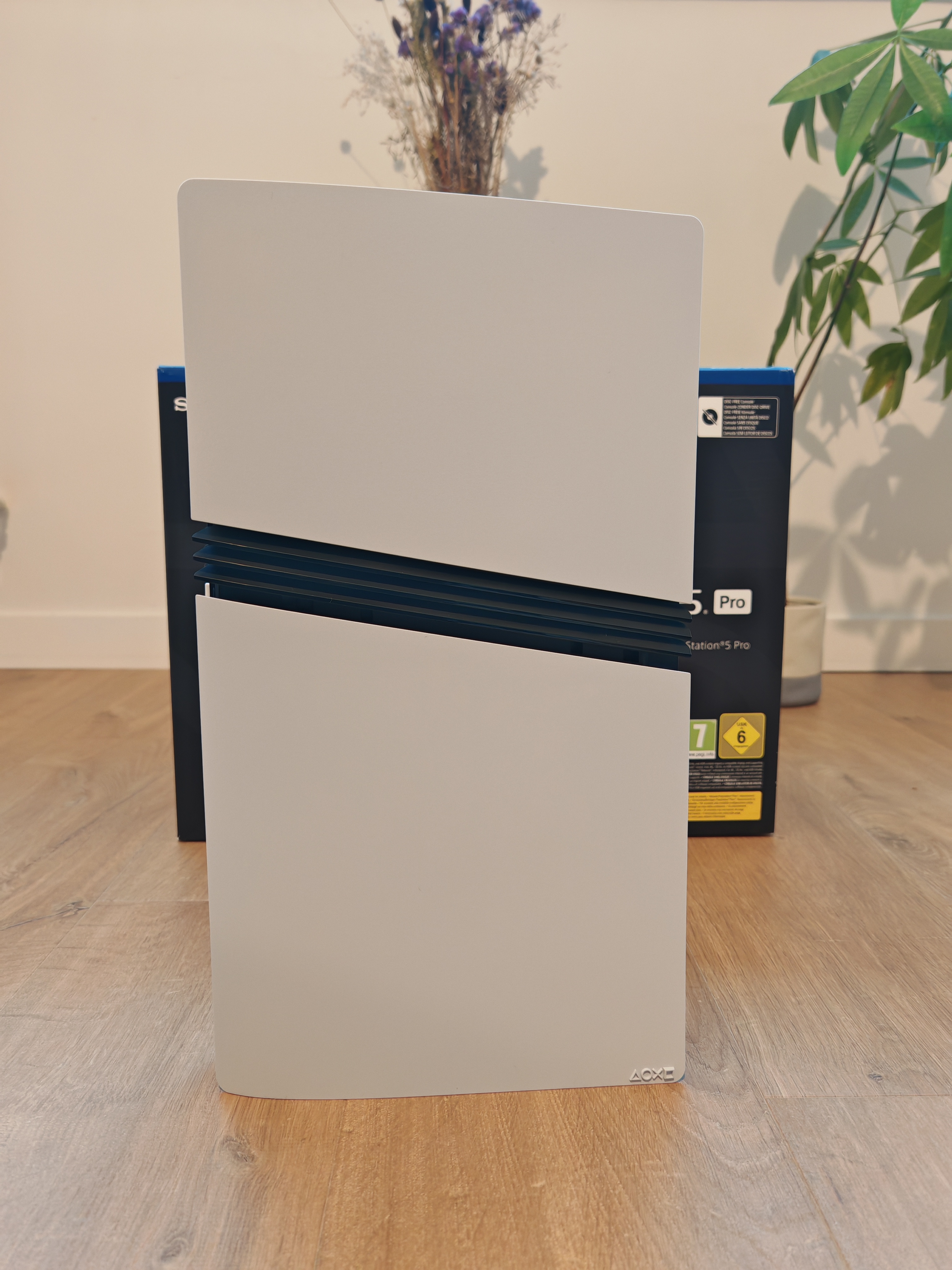 La PS5 Pro se distingue dès le premier coup d’œil. Bien qu’elle reste massive pour une console de salon, elle est plus compacte et plus légère que le modèle classique. Cette